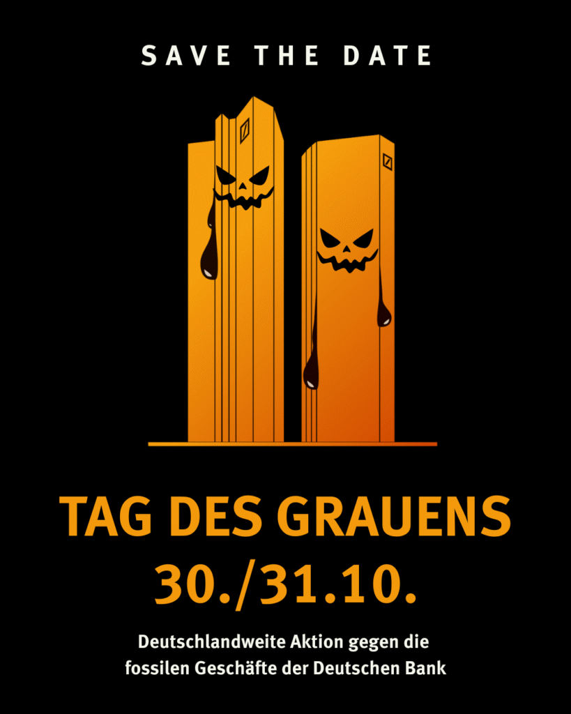 Mit einer Performance machen die Parents for Future Berlin auf die fossilen Geschäfte der Deutschen Bank aufmerksam. Die Aktion findet im Rahmen des „Tag des Grauens“ von urgewald statt. Der gemeinnützige Verein ruft deutschlandweit zu Aktionen auf, um die tödlichen Geschäftspraktiken der Deutschen Bank sichtbar zu machen.